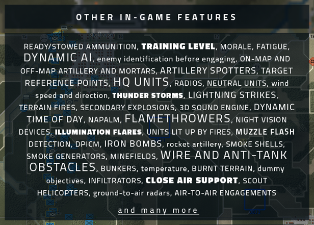 Large maps, modelled upon real terrain make each battle a true test of wits. Weather and visibility all play a role and with several munition types, including air to air combat and artillery, no battle will be the same. Exciting and challenging tank warfare only adds to the level of realism.