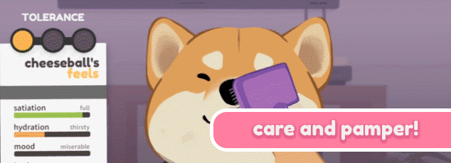 Choose between four adoptable shelter pups to take on your journey through laughter, love and existential crises - a Maltese, a Shiba Inu, a Mutt and a Staffordshire Terrier! Each pup has their own backstory, personality, strengths and weaknesses, just like any other shelter pup in need of love and a good home.