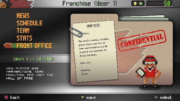 Select your favorite team and play through an infinite number of seasons to see if you can win the Legend Bowl! You'll start off by selecting your favorite team and creating your very own coach or choose from an existing coach from the league. From there you'll play a full 17 week schedule, complete with player wire events, player and team stats, weekly wrap up news, and more to keep you engaged along the way.Player traits are a major factor in how they play each week and you'll have to manage the chemistry of your team to keep you in the winner's circle. There's also a complete off season where you'll take your team through retirements, free agency, player progression, and a full 7 round draft. The goal is to have a deep and immersive Franchise mode where you can have endless hours of fun and challenge!