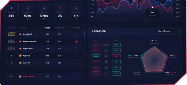 Get the most detailed insights about your aiming in terms of accuracy, reaction time, among other metrics. Our 3D Aim Training data panel shows your performance across tasks and skills to help you measure your progress and improve your aim over time.