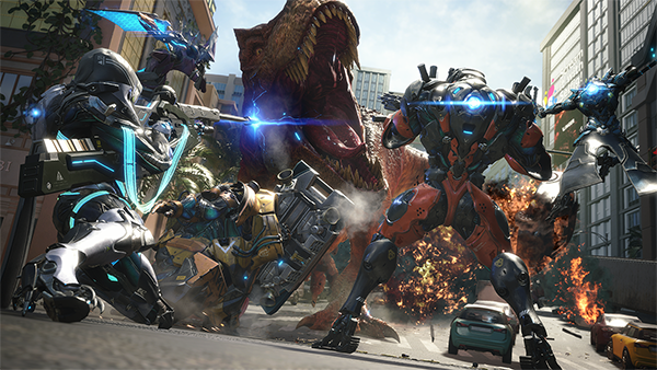 Exosuits are grouped into different roles, and players will pilot these exosuits to hold firm against overwhelming dinosaur swarms in online-only, team-based action game modes.