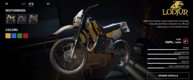 You can now travel through Östertörn on new types of Motorbikes! It’s faster. It’s louder. It’s more exciting! The motorbikes will get you places quicker, but they’ll need fuel to drive. Plan your travel strategically so you won't run out of gasoline unexpectedly, and be sure to check out abandoned cars and gas stations and find jerry cans to fuel up. Or craft the fuel by yourself! You can ride on 3 different models. Each of them has their own strengths and weaknesses: