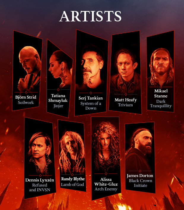 Every track is created specifically for the game with vocals by metal icons, such as Serj Tankian (System of a Down), Matt Heafy (Trivium), Mikael Stanne (Dark Tranquillity), Randy Blythe (Lamb of God), Alissa White-Gluz (Arch Enemy) and Tatiana Shmailyuk (Jinjer).