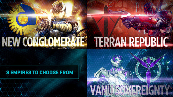 Players will choose to align with one of three empires: the militaristic, authoritarian Terran Republic; the rebellious, freedom-fighting New Conglomerate; or the technocratic, alien-influenced Vanu Sovereignty. Each empire has access to empire-specific weapons, attachments, vehicles, abilities, and more.